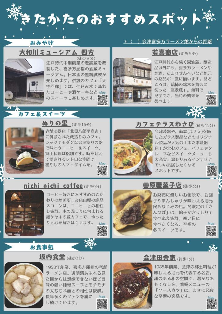 2026/1/17 – 2/1 は裏磐梯スキーシャトルバスが、日中1便に喜多方市内まで運行いたします。2時間ほどの滞在時間となり、喜多方ラーメンや散策、お土産のお買い物などにもご利用いただけます。ご利用料金は無料です。